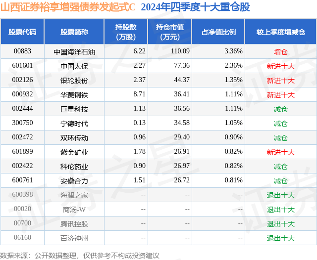 从基金规模来看,山西证券裕享增强债券发起式C基金2024年四季度公布的基金规模为0.05亿元,较上一期规模1125.42万元变化了-674.74万元,环比变化了-59.95%。该基金最新一期资产配置为:股票占净值比19.4%,债券占净值比89.58%,现金占净值比2.38%。从基金持仓来看,该基金当季前十大股票仓位达13.69%,第一大重仓股为中国海洋石油(00883),持仓占比为3.36%。