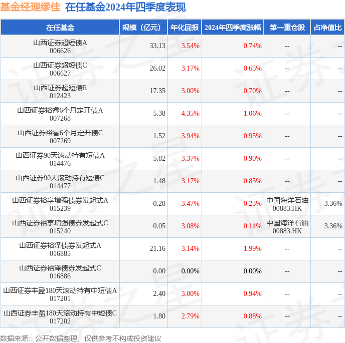 证券之星消息,日前山西证券裕享增强债券发起式C基金公布四季报,2024年四季度最新规模0.05亿元,季度净值涨幅为0.14%。