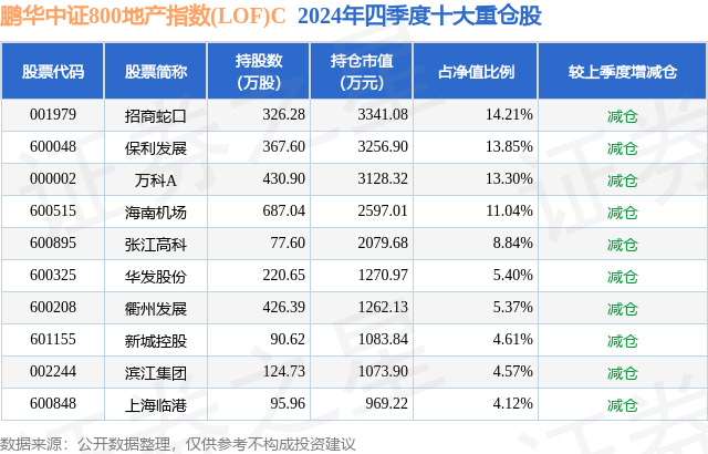 从基金规模来看,鹏华中证800地产指数(LOF)C基金2024年四季度公布的基金规模为0.77亿元,较上一期规模9239.8万元变化了-1519.0万元,环比变化了-16.44%。该基金最新一期资产配置为:股票占净值比94.63%,无债券类资产,现金占净值比6.05%。从基金持仓来看,该基金当季前十大股票仓位达85.31%,第一大重仓股为招商蛇口(001979),持仓占比为14.21%。