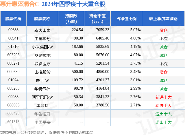 从基金规模来看,惠升惠泽混合C基金2024年四季度公布的基金规模为7.98亿元,较上一期规模5.87亿元变化了2.11亿元,环比变化了35.99%。该基金最新一期资产配置为:股票占净值比81.16%,债券占净值比2.19%,现金占净值比17.34%。从基金持仓来看,该基金当季前十大股票仓位达36.61%,第一大重仓股为农夫山泉(09633),持仓占比为5.07%。