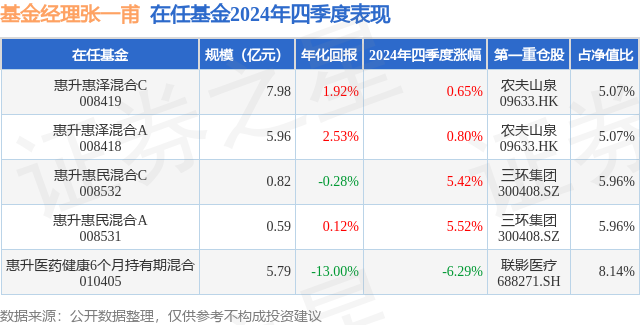证券之星消息,日前惠升惠泽混合C基金公布四季报,2024年四季度最新规模7.98亿元,季度净值涨幅为0.65%。