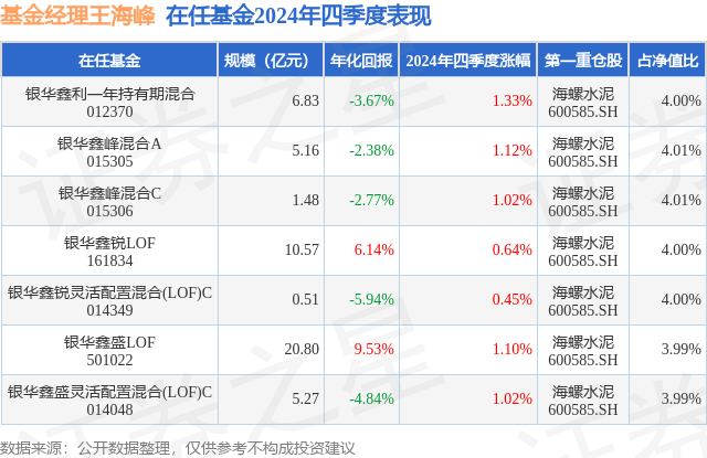 从基金规模来看,银华鑫峰混合A基金2024年四季度公布的基金规模为5.16亿元,较上一期规模4.9亿元变化了2641.4万元,环比变化了5.39%。该基金最新一期资产配置为:股票占净值比82.22%,无债券类资产,现金占净值比18.05%。从基金持仓来看,该基金当季前十大股票仓位达19.25%,第一大重仓股为海螺水泥(600585),持仓占比为4.01%。