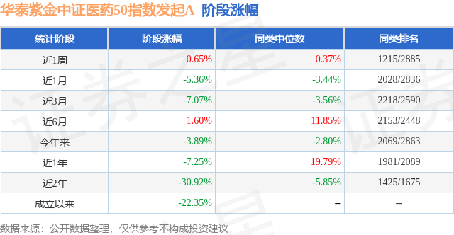 从业绩表现来看,华泰紫金中证医药50指数发起A基金过去一年净值涨幅为-7.25%,在同类基金中排名1981/2089,同类基金过去一年净值涨幅中位数为19.79%。而基金过去一年的最大回撤为-22.43%,成立以来的最大回撤为-43.46%。