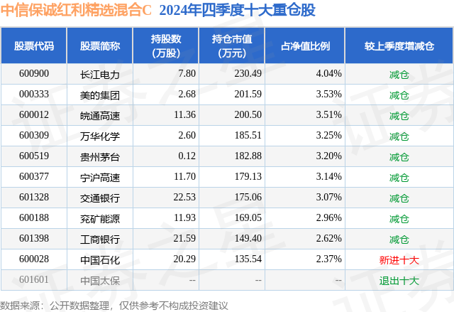 证券之星消息,日前中信保诚红利精选混合C基金公布四季报,2024年四季度最新规模0.3亿元,季度净值涨幅为-2.27%。