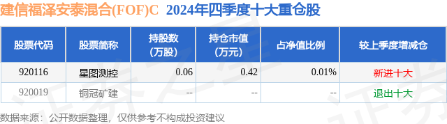 从基金规模来看,建信福泽安泰混合(FOF)C基金2024年四季度公布的基金规模为0.0亿元,较上一期规模0.09万元变化了0.0万元,环比变化了0.72%。该基金最新一期资产配置为:股票占净值比0.01%,债券占净值比5.31%,现金占净值比1.29%。从基金持仓来看,该基金当季前十大股票仓位达0.01%,第一大重仓股为星图测控(920116),持仓占比为0.01%。