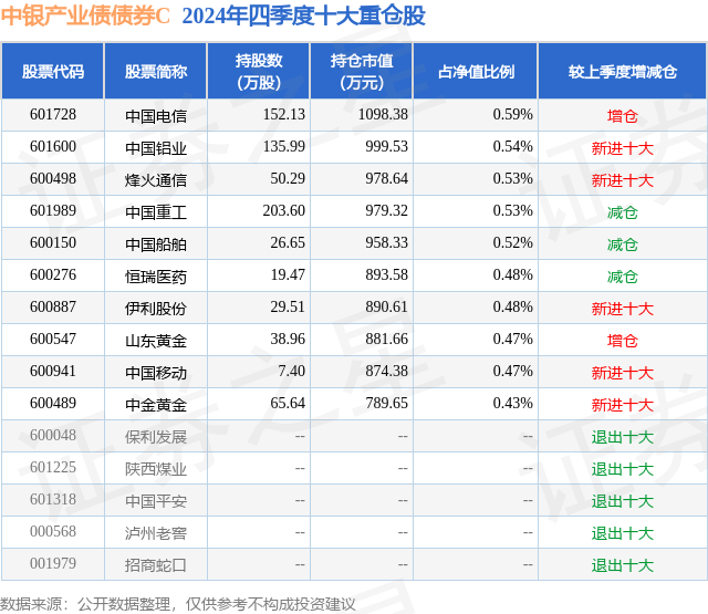从基金规模来看,中银产业债债券C基金2024年四季度公布的基金规模为0.37亿元,较上一期规模161.4万元变化了3548.21万元,环比变化了2198.35%。该基金最新一期资产配置为:股票占净值比12.42%,债券占净值比92.79%,现金占净值比1.5%。从基金持仓来看,该基金当季前十大股票仓位达5.04%,第一大重仓股为中国电信(601728),持仓占比为0.59%。