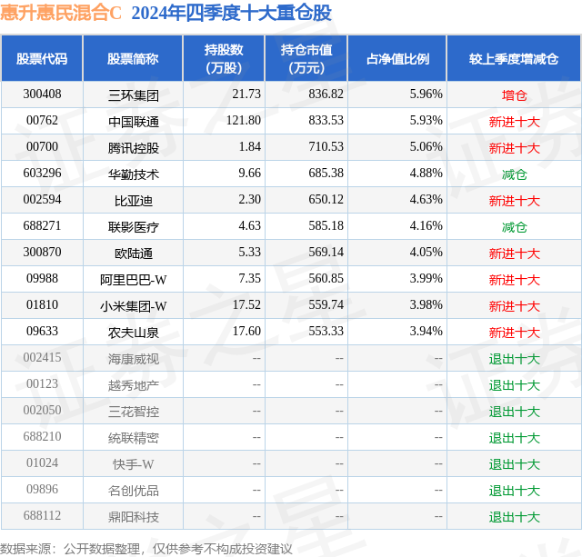 从基金规模来看,惠升惠民混合C基金2024年四季度公布的基金规模为0.82亿元,较上一期规模6369.28万元变化了1799.34万元,环比变化了28.25%。该基金最新一期资产配置为:股票占净值比84.12%,无债券类资产,现金占净值比20.84%。从基金持仓来看,该基金当季前十大股票仓位达46.58%,第一大重仓股为三环集团(300408),持仓占比为5.96%。