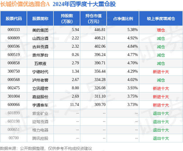 从基金规模来看,长城价值优选混合A基金2024年四季度公布的基金规模为0.83亿元,较上一期规模9436.23万元变化了-1143.17万元,环比变化了-12.11%。该基金最新一期资产配置为:股票占净值比82.52%,无债券类资产,现金占净值比16.88%。从基金持仓来看,该基金当季前十大股票仓位达44.33%,第一大重仓股为美的集团(000333),持仓占比为5.38%。