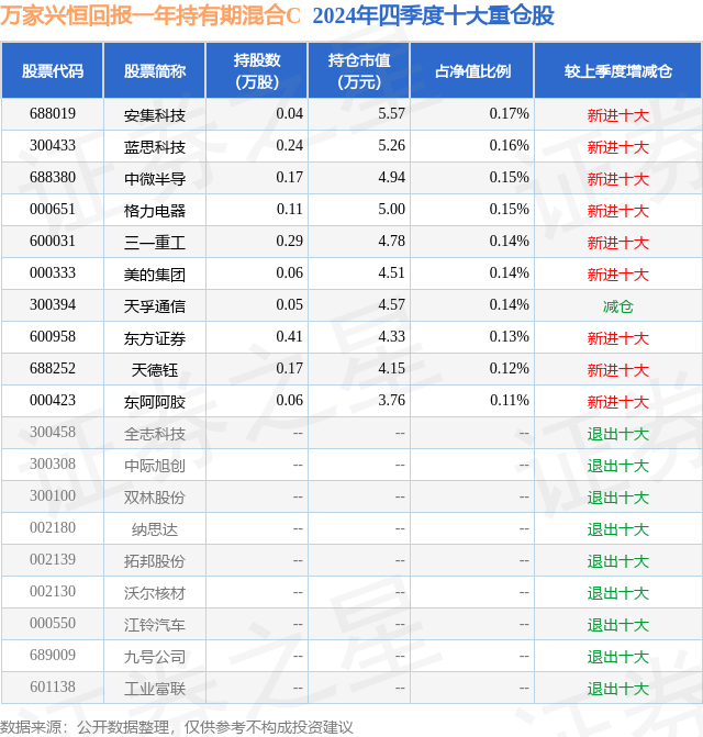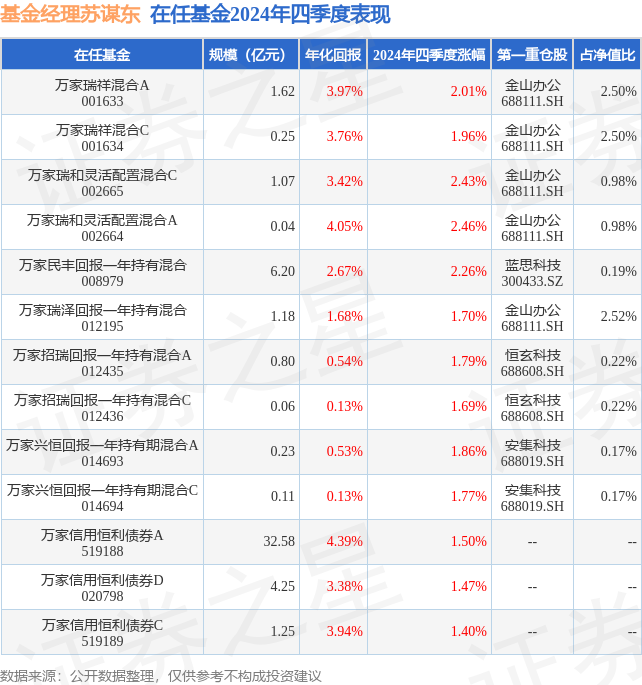 证券之星消息,日前万家兴恒回报一年持有期混合C基金公布四季报,2024年四季度最新规模0.11亿元,季度净值涨幅为1.77%。
