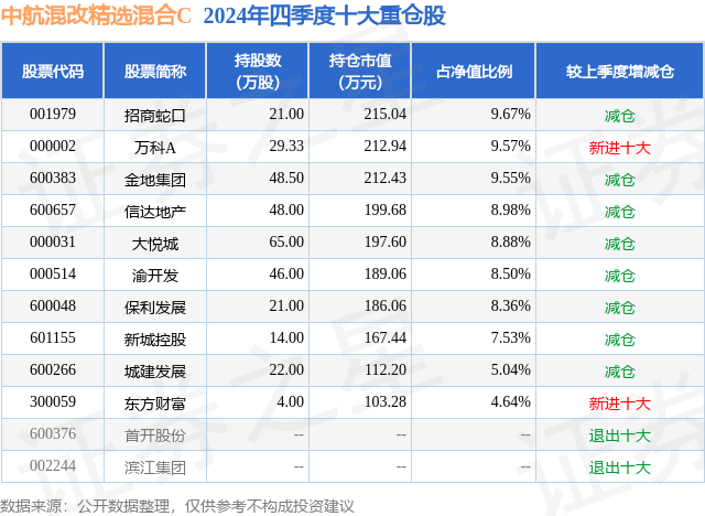 从基金规模来看,中航混改精选混合C基金2024年四季度公布的基金规模为0.16亿元,较上一期规模9624.9万元变化了-8036.53万元,环比变化了-83.5%。该基金最新一期资产配置为:股票占净值比86.66%,无债券类资产,现金占净值比12.53%。从基金持仓来看,该基金当季前十大股票仓位达80.72%,第一大重仓股为招商蛇口(001979),持仓占比为9.67%。