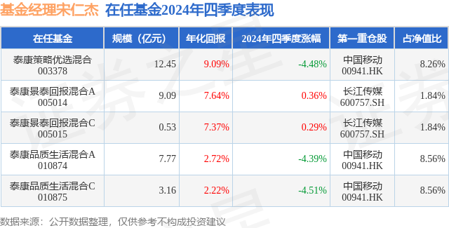 证券之星消息,日前泰康景泰回报混合C基金公布四季报,2024年四季度最新规模0.53亿元,季度净值涨幅为0.29%。