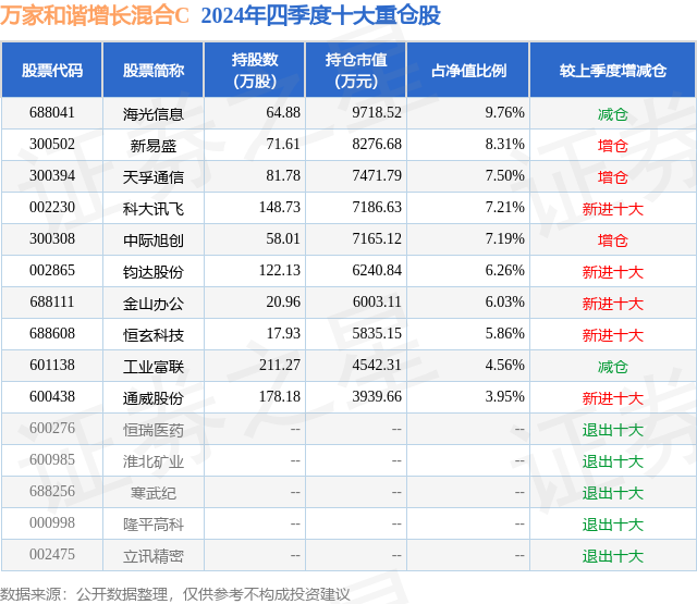 证券之星消息,日前万家和谐增长混合C基金公布四季报,2024年四季度最新规模1.16亿元,季度净值涨幅为-0.89%。