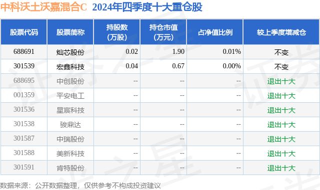 证券之星消息,日前中科沃土沃嘉混合C基金公布四季报,2024年四季度最新规模0.78亿元,季度净值涨幅为0.84%。