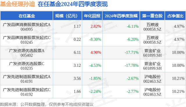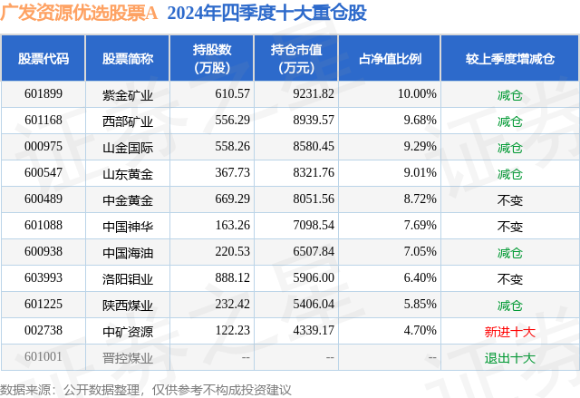从基金规模来看,广发资源优选股票A基金2024年四季度公布的基金规模为6.11亿元,较上一期规模8.81亿元变化了-2.7亿元,环比变化了-30.61%。该基金最新一期资产配置为:股票占净值比94.18%,无债券类资产,现金占净值比6.21%。从基金持仓来看,该基金当季前十大股票仓位达78.39%,第一大重仓股为紫金矿业(601899),持仓占比为10.0%。