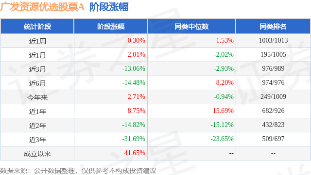 从业绩表现来看,广发资源优选股票A基金过去一年净值涨幅为8.75%,在同类基金中排名682/926,同类基金过去一年净值涨幅中位数为15.69%。而基金过去一年的最大回撤为-23.27%,成立以来的最大回撤为-58.88%。