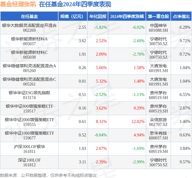 银华稳健增利灵活配置混合A现任基金经理为张凯 杨腾。其中在任基金经理张凯已从业12年又72天,2021年9月28日正式接手管理银华稳健增利灵活配置混合A,任职期间累计回报为-19.13%。目前还管理着11只基金产品(包括A类和C类),其中本季度表现最佳的基金为银华中证2000增强策略ETF(159555),季度净值涨幅为12.02%。
