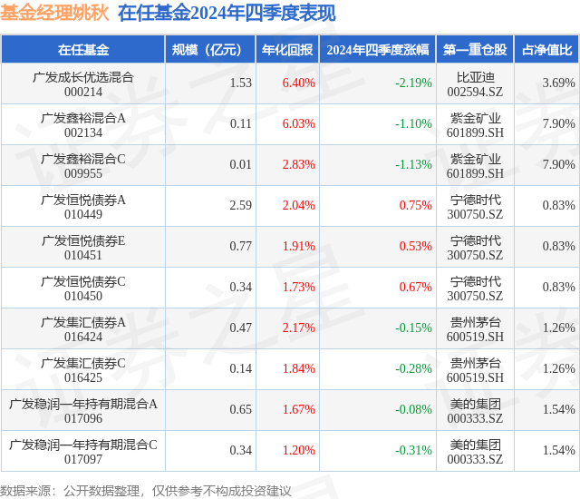 证券之星消息,日前广发集汇债券C基金公布四季报,2024年四季度最新规模0.14亿元,季度净值涨幅为-0.28%。
