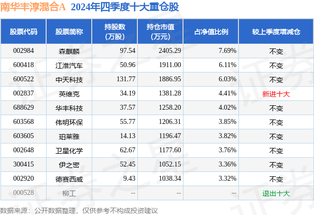 从基金规模来看,南华丰淳混合A基金2024年四季度公布的基金规模为2.96亿元,较上一期规模2.96亿元变化了-0.24万元,环比变化了-0.0%。该基金最新一期资产配置为:股票占净值比84.88%,债券占净值比28.76%,现金占净值比0.59%。从基金持仓来看,该基金当季前十大股票仓位达46.37%,第一大重仓股为森麒麟(002984),持仓占比为7.69%。