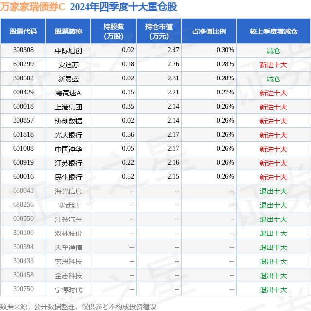 从基金规模来看,万家家瑞债券C基金2024年四季度公布的基金规模为0.02亿元,较上一期规模1063.04万元变化了-847.08万元,环比变化了-79.68%。该基金最新一期资产配置为:股票占净值比16.0%,债券占净值比87.81%,现金占净值比1.13%。从基金持仓来看,该基金当季前十大股票仓位达2.69%,第一大重仓股为中际旭创(300308),持仓占比为0.3%。