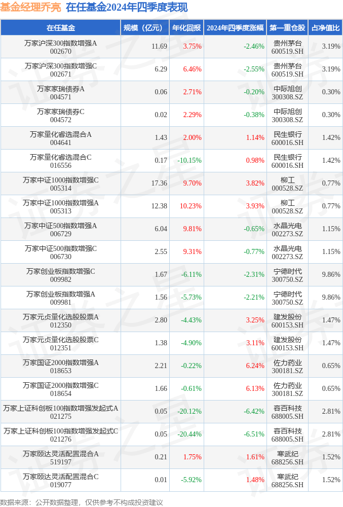 证券之星消息,日前万家家瑞债券C基金公布四季报,2024年四季度最新规模0.02亿元,季度净值涨幅为-0.38%。