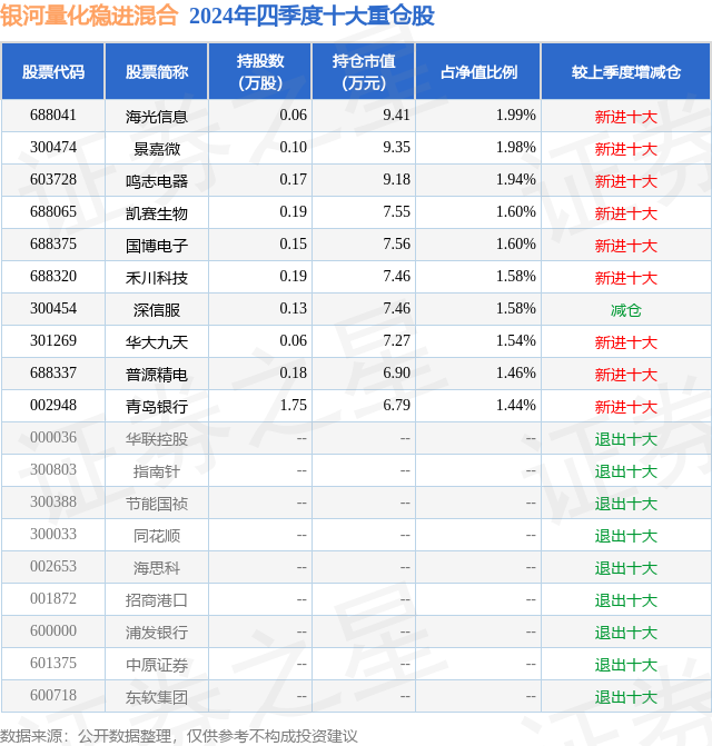 从基金规模来看,银河量化稳进混合基金2024年四季度公布的基金规模为0.05亿元,较上一期规模565.91万元变化了-93.91万元,环比变化了-16.59%。该基金最新一期资产配置为:股票占净值比70.53%,无债券类资产,现金占净值比30.46%。从基金持仓来看,该基金当季前十大股票仓位达16.71%,第一大重仓股为海光信息(688041),持仓占比为1.99%。