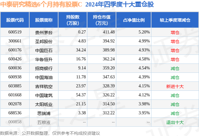从基金规模来看,中泰研究精选6个月持有股票C基金2024年四季度公布的基金规模为0.39亿元,较上一期规模4672.77万元变化了-752.45万元,环比变化了-16.1%。该基金最新一期资产配置为:股票占净值比87.6%,无债券类资产,现金占净值比12.72%。从基金持仓来看,该基金当季前十大股票仓位达44.83%,第一大重仓股为贵州茅台(600519),持仓占比为5.2%。