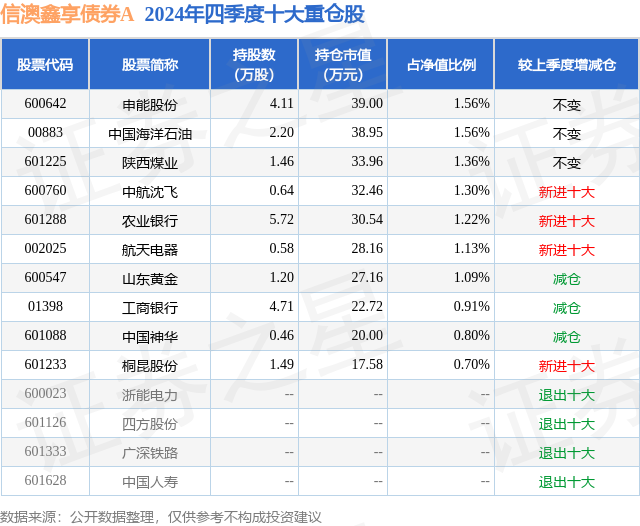 从基金规模来看,信澳鑫享债券A基金2024年四季度公布的基金规模为0.25亿元,较上一期规模4624.41万元变化了-2159.05万元,环比变化了-46.69%。该基金最新一期资产配置为:股票占净值比17.51%,债券占净值比91.07%,现金占净值比4.15%。从基金持仓来看,该基金当季前十大股票仓位达11.63%,第一大重仓股为申能股份(600642),持仓占比为1.56%。