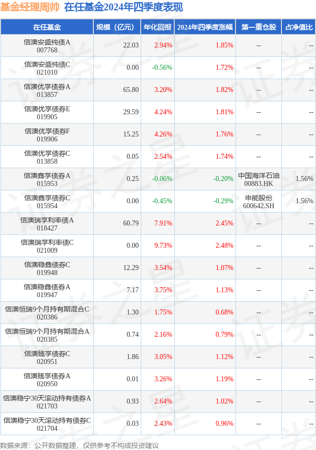信澳鑫享债券A现任基金经理为周帅,近期离任的基金经理为李淑彦。其中在任基金经理周帅已从业3年又306天,2024年2月29日正式接手管理信澳鑫享债券A,任职期间累计回报为1.91%。目前还管理着18只基金产品(包括A类和C类),其中本季度表现最佳的基金为信澳瑞享利率债C(021009),季度净值涨幅为2.48%。