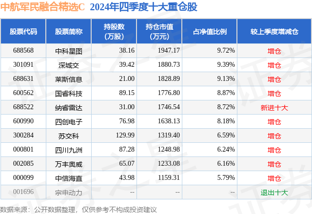 从基金规模来看,中航军民融合精选C基金2024年四季度公布的基金规模为1.49亿元,较上一期规模2107.86万元变化了1.28亿元,环比变化了607.63%。该基金最新一期资产配置为:股票占净值比90.25%,无债券类资产,现金占净值比8.38%。从基金持仓来看,该基金当季前十大股票仓位达78.79%,第一大重仓股为中科星图(688568),持仓占比为9.72%。