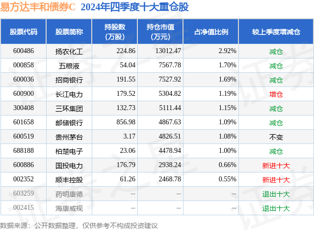 从基金规模来看,易方达丰和债券C基金2024年四季度公布的基金规模为2.42亿元,较上一期规模1.07亿元变化了1.35亿元,环比变化了125.98%。该基金最新一期资产配置为:股票占净值比14.94%,债券占净值比113.42%,现金占净值比1.0%。从基金持仓来看,该基金当季前十大股票仓位达13.03%,第一大重仓股为扬农化工(600486),持仓占比为2.92%。