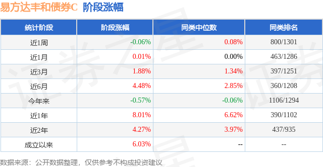 从业绩表现来看,易方达丰和债券C基金过去一年净值涨幅为8.01%,在同类基金中排名390/1102,同类基金过去一年净值涨幅中位数为6.62%。而基金过去一年的最大回撤为-3.34%,成立以来的最大回撤为-4.19%。