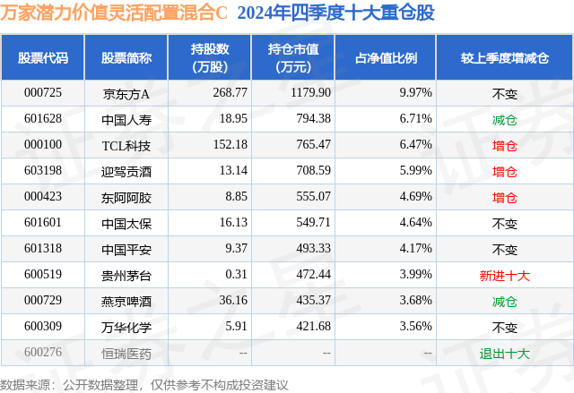 从基金规模来看,万家潜力价值灵活配置混合C基金2024年四季度公布的基金规模为0.07亿元,较上一期规模968.33万元变化了-274.24万元,环比变化了-28.32%。该基金最新一期资产配置为:股票占净值比91.02%,无债券类资产,现金占净值比11.52%。从基金持仓来看,该基金当季前十大股票仓位达53.87%,第一大重仓股为京东方A(000725),持仓占比为9.97%。