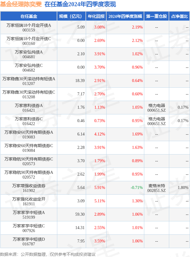 证券之星消息,日前万家惠利债券C基金公布四季报,2024年四季度最新规模0.46亿元,季度净值涨幅为0.95%。