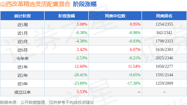 从业绩表现来看,山西改革精选灵活配置混合基金过去一年净值涨幅为12.6%,在同类基金中排名1050/2277,同类基金过去一年净值涨幅中位数为11.54%。而基金过去一年的最大回撤为-18.09%,成立以来的最大回撤为-46.4%。