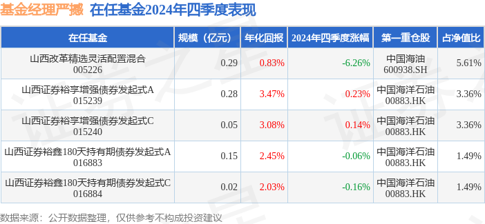 山西改革精选灵活配置混合现任基金经理为严撼。其中在任基金经理严撼已从业2年又168天,2023年11月13日正式接手管理山西改革精选灵活配置混合,任职期间累计回报为-3.01%。目前还管理着5只基金产品(包括A类和C类),其中本季度表现最佳的基金为山西证券裕享增强债券发起式A(015239),季度净值涨幅为0.23%。
