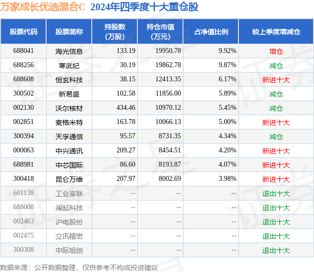 从基金规模来看,万家成长优选混合C基金2024年四季度公布的基金规模为11.05亿元,较上一期规模8.95亿元变化了2.1亿元,环比变化了23.49%。该基金最新一期资产配置为:股票占净值比86.92%,无债券类资产,现金占净值比13.35%。从基金持仓来看,该基金当季前十大股票仓位达58.89%,第一大重仓股为海光信息(688041),持仓占比为9.92%。