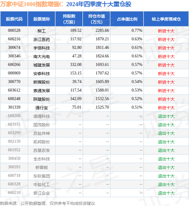 对本季度基金运作,基金经理的观点如下:2024年四季度,A股市场整体处于震荡整理行情,10月份至12月上旬,中小盘股票表现活跃,进入12月中下旬,由于年底资金结算,部分投资者选择落袋为安,风险偏好降低,市场偏向大盘高股息板块。 u3000u3000展望后市,四季度召开多次重磅会议,对未来经济走势提供前瞻指引。10月12日国务院新闻发布会提出将围绕稳增长、扩内需、防风险三个方面推出一系列增量政策,中央财政还有较大的举债空间和赤字空间;12月9日中央政治局会议宣布实施更加积极的财政政策和适度宽松的货币政策,加强超常规逆周期调节,财政政策基调转为"更加积极",货币政策基调从2011年后首次由"稳健"转为"适度宽松"。总体而言,四季度重磅会议政策表态非常积极,更加积极的财政政策和适度宽松的货币政策有望形成一套组合拳,推动经济结构转型和高质量发展,预计经济继续渐进式好转,A股市场有望维持震荡上涨行情。 u3000u3000本基金为指数增强型股票基金,采取量化方法进行积极的指数组合管理与风险控制,在力求有效跟踪标的指数基础上,力争在控制本基金净值增长率与业绩比较基准之间的日均跟踪偏离度的绝对值不超过0.5%、年跟踪误差不超过7.75%的基础上,实现超越目标指数的投资收益,谋求基金资产的长期增值。 u3000u3000万家中证1000指数增强基金采用量化多因子选股策略,控制行业权重偏离度、个股集中度,通过量化多因子选股的方式选取一篮子股票组合。在行业和风格配置相对于业绩基准指数相对均衡,无重仓行业或具体风格,在量化选股方面精选行业内质优个股组合,持股较为分散。采用量化风险模型合理控制组合风险,保证较小的跟踪误差,投资目标是获取在既定跟踪误差下的超额收益最大化。本基金股票组合中80%以上权重为中证1000成分股,保持了跟标的指数的风格基本一致。 u3000u3000后续投资运作继续坚持以量化多因子选股为策略基础,积极参与科创、创业板打新等事件性机会,追求长期稳健的超额收益。