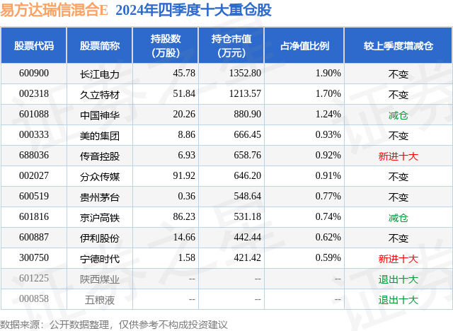 从基金规模来看,易方达瑞信混合E基金2024年四季度公布的基金规模为2.38亿元,较上一期规模2.71亿元变化了-3265.55万元,环比变化了-12.05%。该基金最新一期资产配置为:股票占净值比18.78%,债券占净值比117.71%,现金占净值比1.32%。从基金持仓来看,该基金当季前十大股票仓位达10.32%,第一大重仓股为长江电力(600900),持仓占比为1.9%。