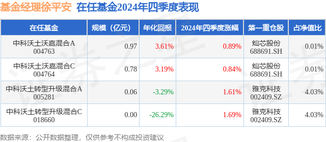 证券之星消息,日前中科沃土转型升级混合A基金公布四季报,2024年四季度最新规模0.06亿元,季度净值涨幅为1.61%。