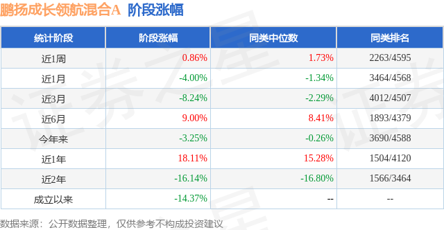 从业绩表现来看,鹏扬成长领航混合A基金过去一年净值涨幅为18.11%,在同类基金中排名1504/4120,同类基金过去一年净值涨幅中位数为15.28%。而基金过去一年的最大回撤为-20.7%,成立以来的最大回撤为-32.56%。