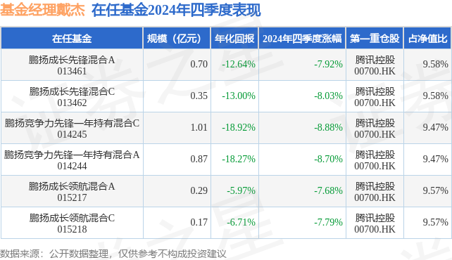 从基金规模来看,鹏扬成长领航混合A基金2024年四季度公布的基金规模为0.29亿元,较上一期规模3536.01万元变化了-672.35万元,环比变化了-19.01%。该基金最新一期资产配置为:股票占净值比91.4%,债券占净值比6.22%,现金占净值比2.0%。从基金持仓来看,该基金当季前十大股票仓位达54.14%,第一大重仓股为腾讯控股(00700),持仓占比为9.57%。