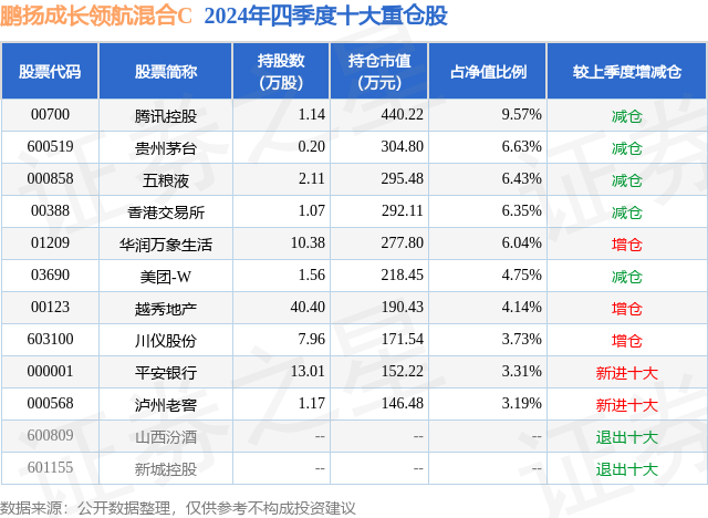 从基金规模来看,鹏扬成长领航混合C基金2024年四季度公布的基金规模为0.17亿元,较上一期规模2062.62万元变化了-327.86万元,环比变化了-15.9%。该基金最新一期资产配置为:股票占净值比91.4%,债券占净值比6.22%,现金占净值比2.0%。从基金持仓来看,该基金当季前十大股票仓位达54.14%,第一大重仓股为腾讯控股(00700),持仓占比为9.57%。