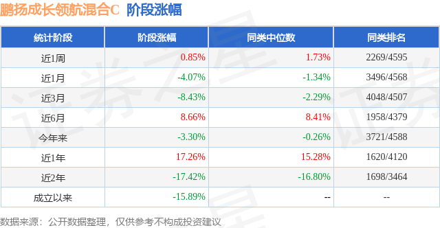 从业绩表现来看,鹏扬成长领航混合C基金过去一年净值涨幅为17.26%,在同类基金中排名1620/4120,同类基金过去一年净值涨幅中位数为15.28%。而基金过去一年的最大回撤为-20.87%,成立以来的最大回撤为-33.09%。