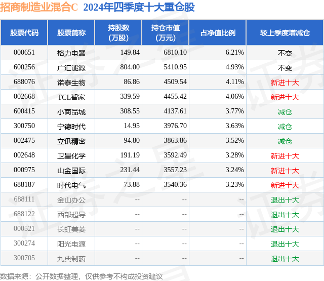 从基金规模来看,招商制造业混合C基金2024年四季度公布的基金规模为3.22亿元,较上一期规模3.63亿元变化了-4140.28万元,环比变化了-11.4%。该基金最新一期资产配置为:股票占净值比89.87%,无债券类资产,现金占净值比10.08%。从基金持仓来看,该基金当季前十大股票仓位达39.98%,第一大重仓股为格力电器(000651),持仓占比为6.21%。