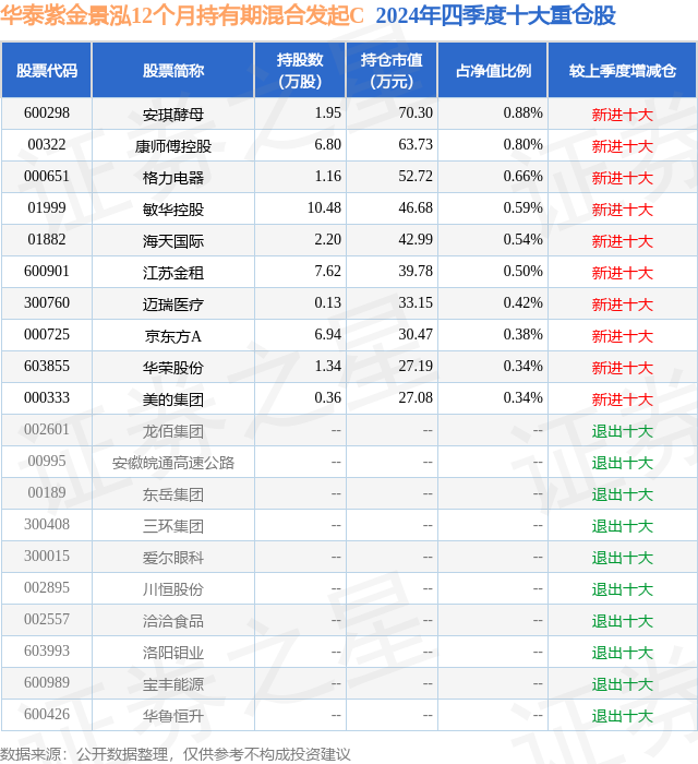 证券之星消息,日前华泰紫金景泓12个月持有期混合发起C基金公布四季报,2024年四季度最新规模0.05亿元,季度净值涨幅为1.1%。