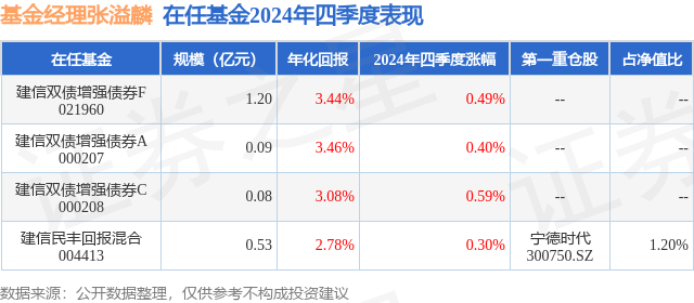 建信民丰回报混合现任基金经理为张溢麟。其中在任基金经理张溢麟已从业2年又19天,2023年1月4日正式接手管理建信民丰回报混合,任职期间累计回报为1.43%。目前还管理着4只基金产品(包括A类和C类),其中本季度表现最佳的基金为建信双债增强债券C(000208),季度净值涨幅为0.59%。