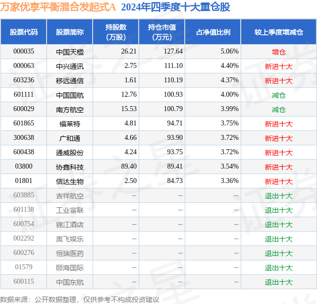 从基金规模来看,万家优享平衡混合发起式A基金2024年四季度公布的基金规模为0.25亿元,较上一期规模3032.83万元变化了-534.99万元,环比变化了-17.64%。该基金最新一期资产配置为:股票占净值比61.57%,债券占净值比26.82%,现金占净值比10.94%。从基金持仓来看,该基金当季前十大股票仓位达39.91%,第一大重仓股为中国天楹(000035),持仓占比为5.06%。