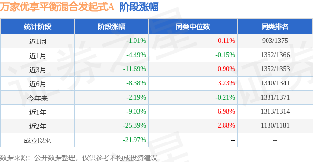从业绩表现来看,万家优享平衡混合发起式A基金过去一年净值涨幅为-9.03%,在同类基金中排名1313/1314,同类基金过去一年净值涨幅中位数为6.98%。而基金过去一年的最大回撤为-19.53%,成立以来的最大回撤为-29.64%。