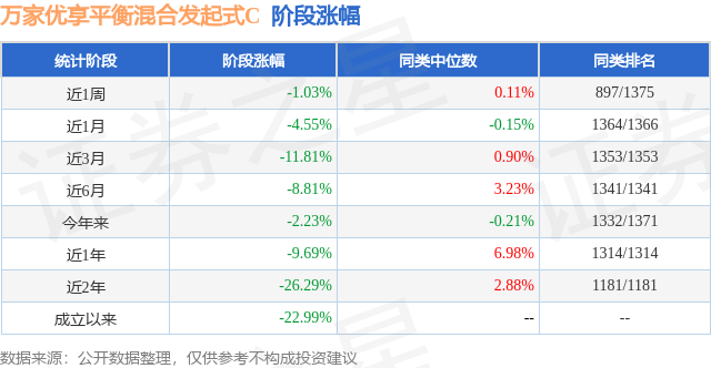 从业绩表现来看,万家优享平衡混合发起式C基金过去一年净值涨幅为-9.69%,在同类基金中排名1314/1314,同类基金过去一年净值涨幅中位数为6.98%。而基金过去一年的最大回撤为-20.04%,成立以来的最大回撤为-30.46%。