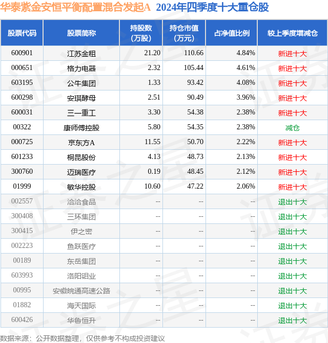 证券之星消息,日前华泰紫金安恒平衡配置混合发起A基金公布四季报,2024年四季度最新规模0.22亿元,季度净值涨幅为-0.19%。